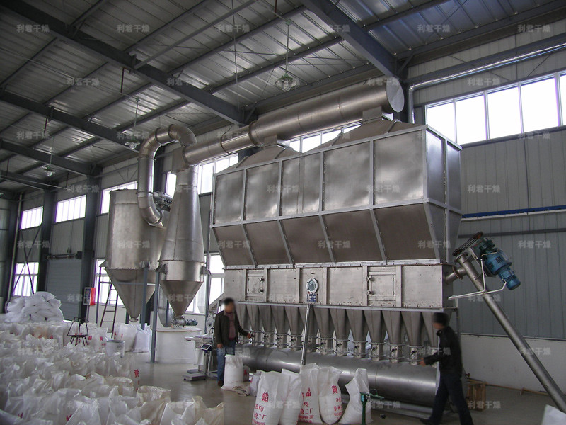 散粒狀固體物料由加料器加入流化床干燥器中,過(guò)濾后的潔凈空氣加熱后由鼓風(fēng)機(jī)送入流化床底部經(jīng)分布板與固體物料接觸,形成流態(tài)化達(dá)到氣固的熱質(zhì)交換。物料干燥后由排料口排出,廢氣由沸騰床頂部排出經(jīng)旋風(fēng)除塵器組和布袋除塵器回收固體粉料后排空。