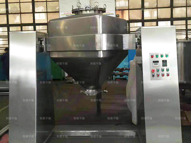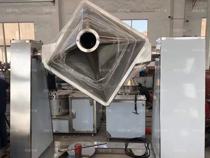 將物料裝入方錐形密閉混合桶內,料斗對稱的軸線與回轉軸軸線成一夾角,不同組分物料在密閉的料斗中進行三維空間運動,產生強烈翻轉和擴散收縮作用,達到理想的混合效果。
